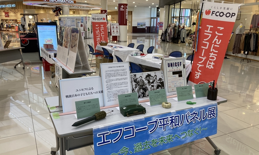 | ■ | エフコープ南部ブロック平和展で、ユニセフパネルや支援物資などを展示し、戦後のユニセフ支援について話しました。 とき 2023年8月19日(月)~8月20日(金)ところ エフコープ久留米店 |