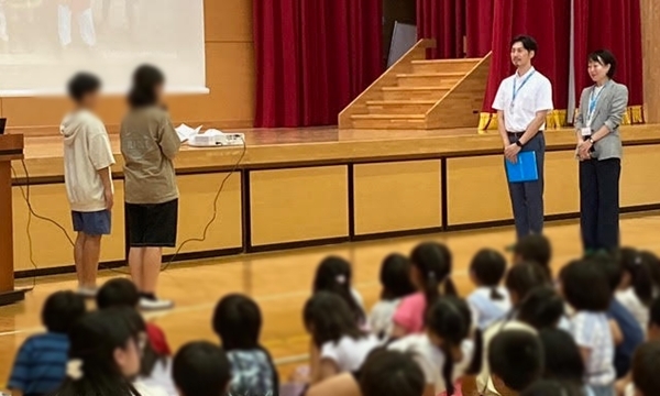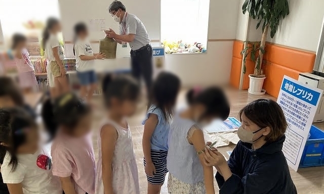 | ■ | 出前授業をいたしました。 とき 2023年10月27日ところ 小郡市立のぞみが丘小学校 天候にも恵まれ、校庭と渡り廊下の階段を使って”水がめ”を運び、室内で”蚊帳”を広げての体験をしました。 |