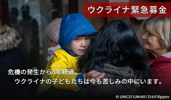 | ■ウクライナの子どもたちの命を守るためにご協力ください。 *郵便局(ゆうちょ銀行) 振替口座:00190-5-31000 口座名義:公益財団法人 日本ユニセフ協会 *通信欄に「ウクライナ、K1-402」と明記願います。 *窓口での振り込みの場合は、送金手数料が免除されます。 *募金は寄付金控除の対象となります ■『ウクライナ危機 1カ月報告書』 ■『ウクライナ危機 6カ月報告書』 ■『ウクライナ支援 1年報告書』 ■『ウクライナ支援 3年報告書』 |