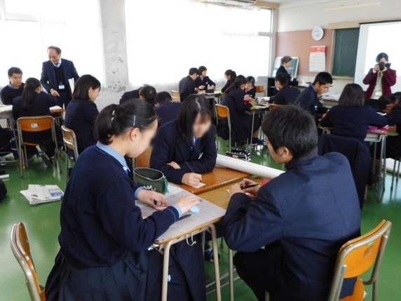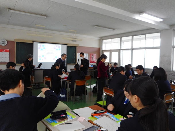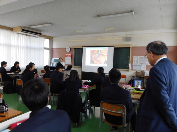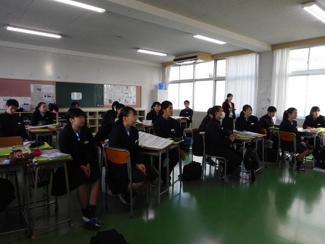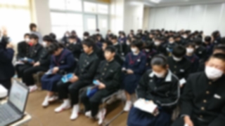 当初1.2年生対象予定でしたが、1年生は、インフルエンザで学年閉鎖となり、2年生のみの出席となりました。体調不良の生徒さんもおられたと思いますが、ユニセフの活動について真剣に授業に参加していただきました。 |