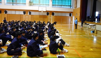 | 出前授業 試合が始まるまでの時間に、『世界の子どもたちと平和』について中学生・小学校低学年・小学校高学年3コマの出前授業をいたしました。