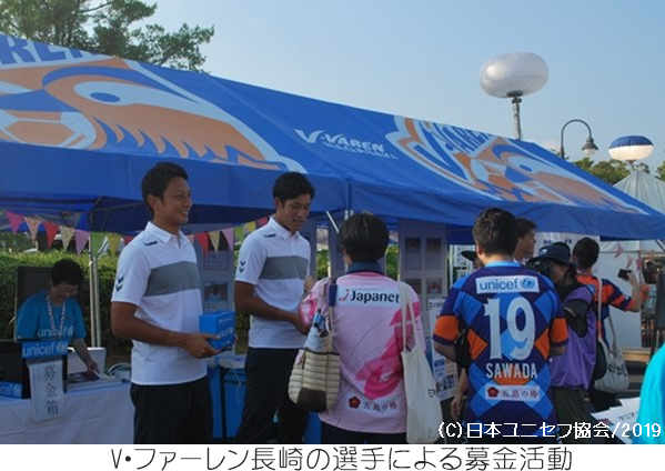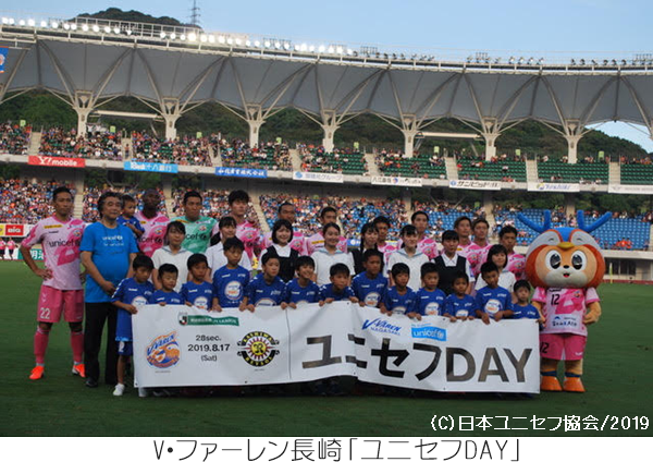V・ファーレン長崎「ユニセフDAY」 ホームゲームで子どもたちの明るい未来と平和を願う特別イベント 日時:2019年8月17日 場所:トランスコスモススタジアム長崎 2019明治安田生命J2リーグ第28節 V・ファーレン長崎 対 柏レイソル戦が『ユニセフDAY』として開催されました。今回 のユニセフDAYは、サッカーを通して世界に長崎から「平和」を発信したいという熱い想いが伝わるイベントでした。 |