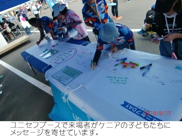 株式会社V・ファーレン長崎と株式会社ジャパネットホールディングスは、2018 年より世界の子どもたちに教育支援や平和の想いを伝える “PLAY(PRAY)for PEACE「未来」のために「今」できること”を実施しています。ユニセフのブースでは、V・ファーレン長崎とジャパネットホールディングスの支援先であるアフリカ・ケニアの子どもたちの映像や、スポーツを通しての教育支援のパネル展示や、選手やクラブマスコット ヴィヴィくんによる募金活動、ケニアの子どもたちへの寄せ書きなどが実施されました。 |