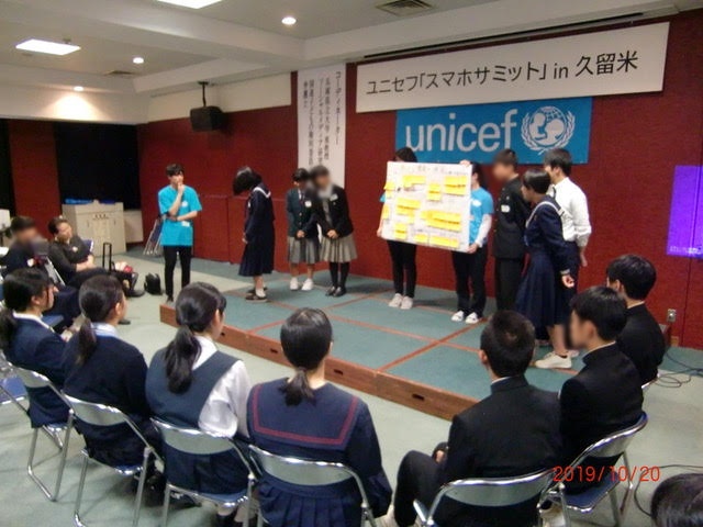 | ユニセフ「スマホサミット」in久留米を開催 日時:2019年10月20日 場所:久留米商工会館5F大ホール 10月20日、子どもの権利条約が採択されて30年、この節目の年に今、子どもたちが直面するネット依存とその対策について、 中学生と高校生自身の身近な問題として大人と共に考える、ユニセフ「スマホサミット」を久留米市教育委員会と共催で開催しました。 |