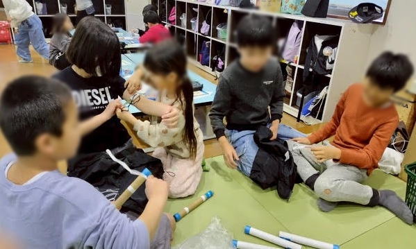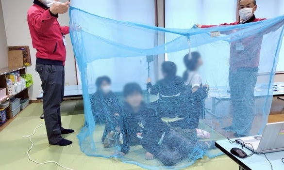 先生方のご協力で、水がめ、蚊帳(かや)、上腕計測メジャーなどの体験学習もしていただきました。